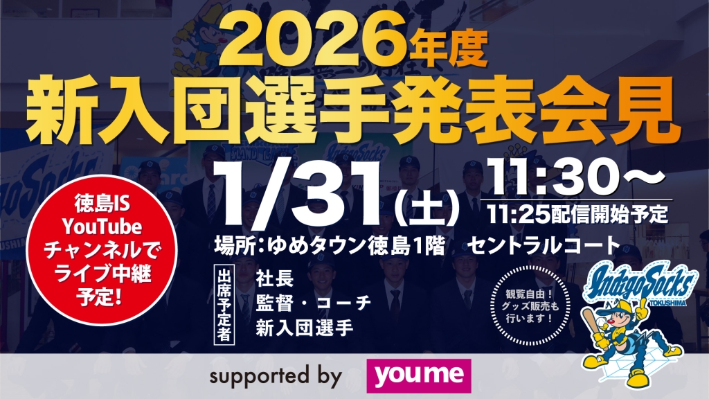 このたび、徳島インディゴソックス球団では、以下の通り「2026年度 徳島インディゴソックス 新入団選手発表記者会見」をゆめタウン徳島にて一般公開で開催することが決まりましたので、お知らせいたします。
