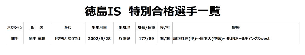 このたび四国アイランドリーグplus・徳島インディゴソックス球団の特別合格選手(球団推薦選手)が決定いたしました。