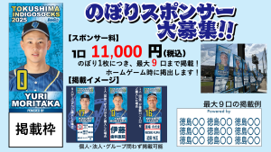 徳島インディゴソックスでは、2026年選手のぼりスポンサーの募集を行っております。
